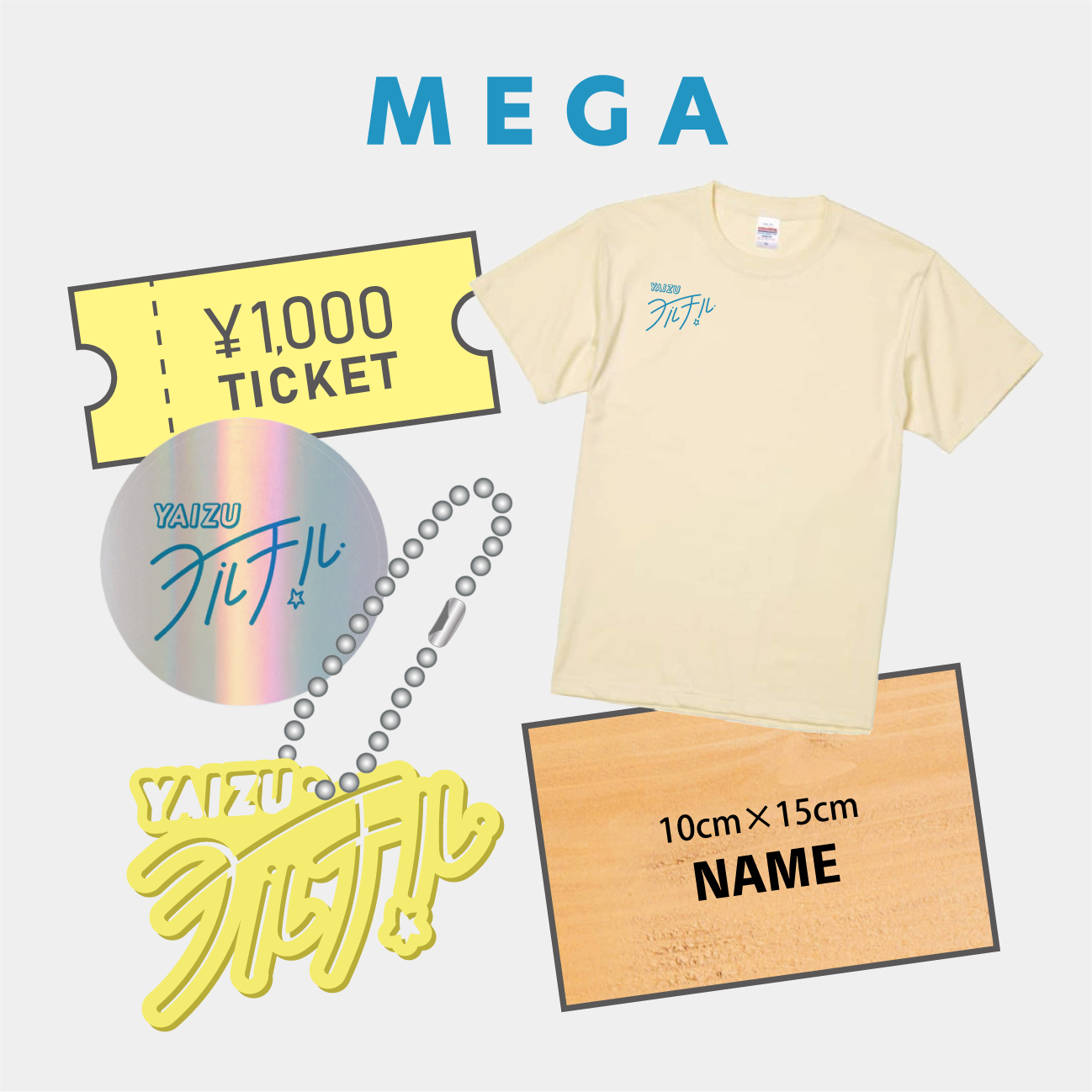 入場チケット、限定ステッカー&キーホルダーに加え、選べるカラーのオリジナルTシャツと入場ゲートパネルへのお名前掲出(大サイズ)が含まれます。